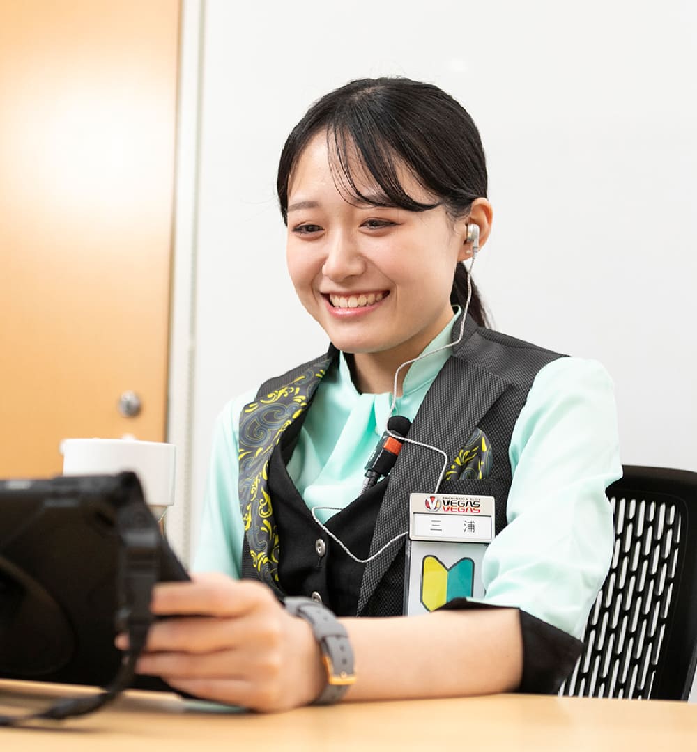 もともとはデザインを学んでいたので、その経験を活かしたい気持ちもありました。でも同時に接客業にもやりがいを感じていて、幅広く会社を探していました。ベガスベガスの企業理念『世界を驚かすワクワクドキドキのエンターテインメント企業を作る。』に惹かれて、ここなら自分がやりたいことを活かしながら挑戦できると思ったのが決め手です。